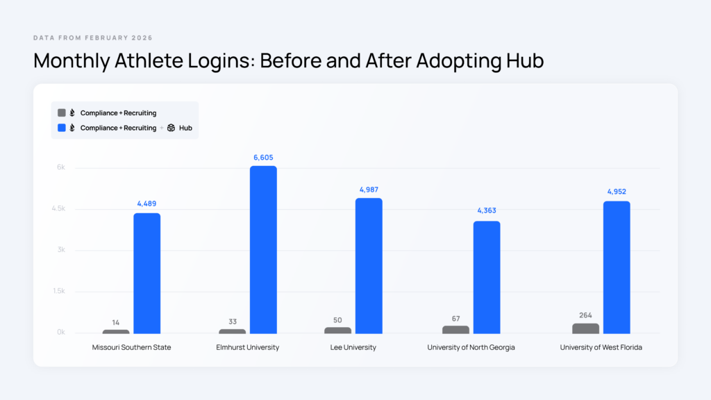 The numbers tell a consistent story. Across six programs, comparing a representative month of athlete logins on Teamworks Compliance + Recruiting alone to the latest month on record since adopting Hub, January through February 2026, the difference is striking regardless of where a program started.